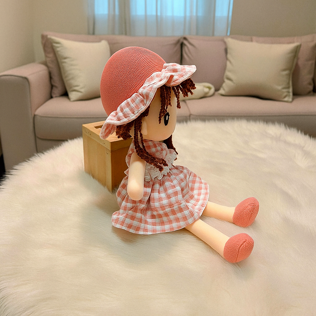 Adorable plush girl doll dressed in a charming hat and floral outfit